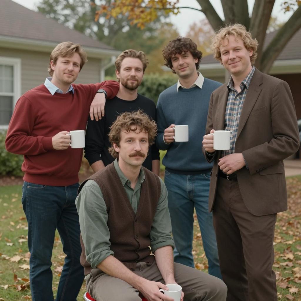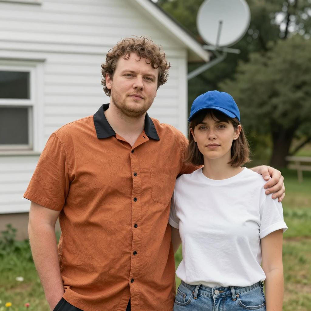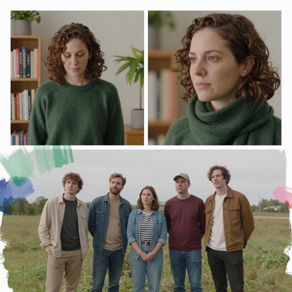 Photograph of four people sitting on a couch. Left: man with glasses, blue shirt, beige pants, holding yellow spiral cord. Center: woman with dark short hair, black floral dress, holding spiral cord. Right: man with brown hair, beard, brown shirt, jeans, looking away. Far right: woman with long dark hair, blue patterned shirt, holding spiral cord. Background: dimly lit room.