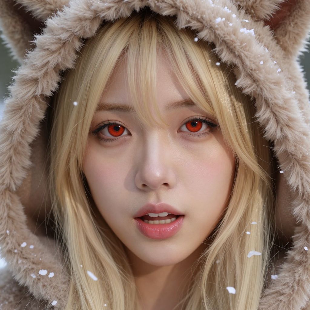 Photorealistic digital portrait of a young woman with fair skin and striking red eyes. She has long, straight blonde hair partially covered by a fluffy, tan, fur-trimmed hood with cat ears. Snowflakes are visible on her face and hood. Her full lips are slightly parted, revealing a hint of her teeth. The background is blurred, focusing attention on her face. The texture of the fur contrasts with her smooth skin, adding depth to the image. The lighting is natural, highlighting her delicate features and the vividness of her eyes.