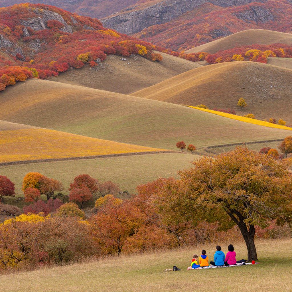 A wide-angle view of multi-colored hills during autumn in a rural countryside, with vibrant reds, yellows, and burnt oranges spreading across rolling fields and rocky slopes, a family of three with children in bright jackets sits on a picnic blanket under a canopy of trees, in a realistic outdoor photography style.
