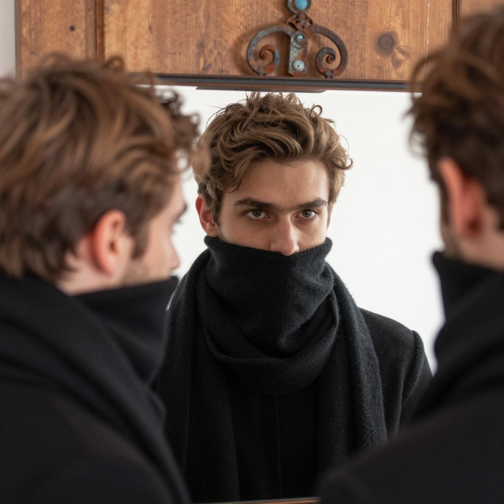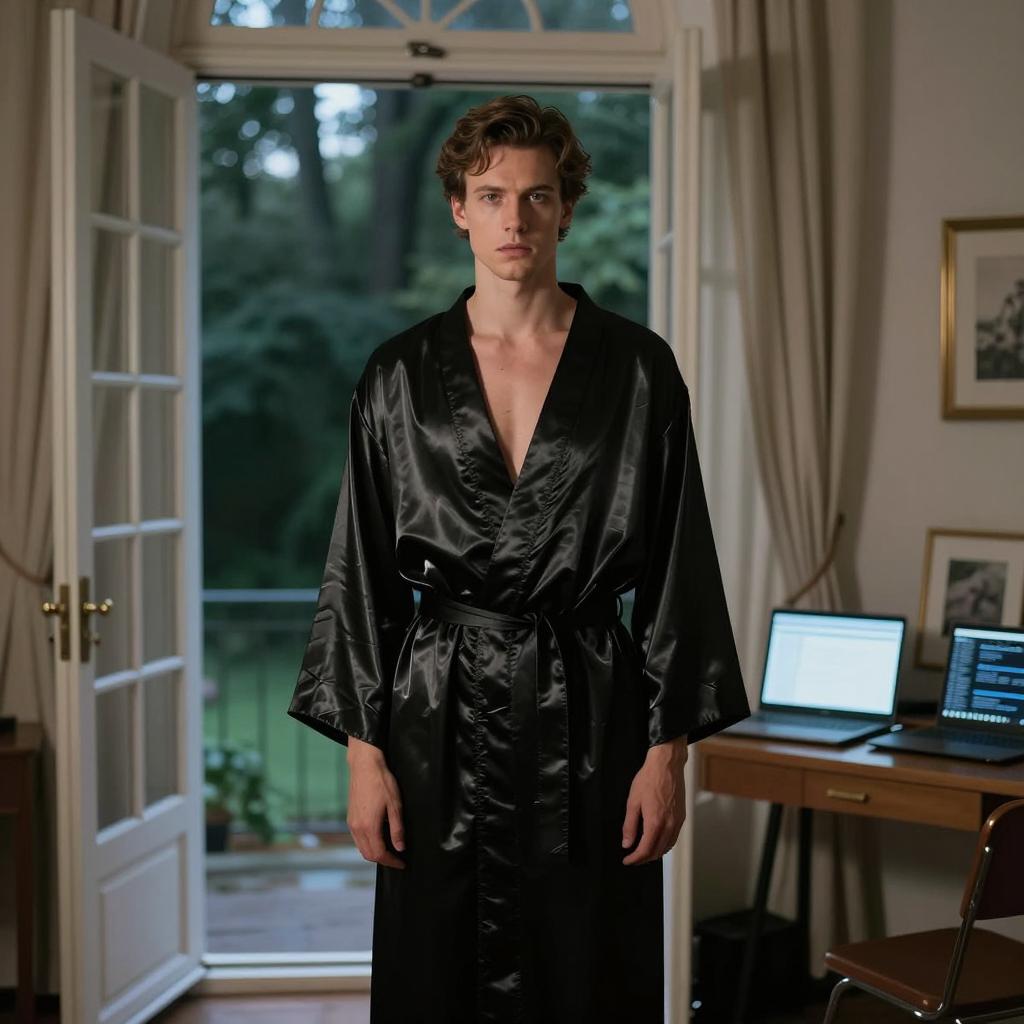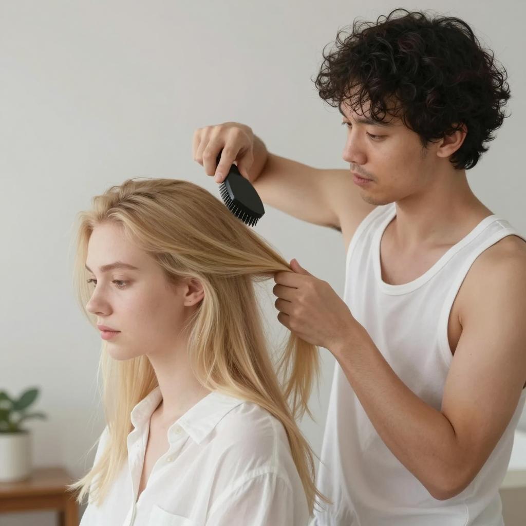 Three men in a room with patterned wallpaper. Center man with long dark hair, wearing a blue towel on his head, black robe, and black pants, being groomed by two men. Left man with curly hair, wearing a gray shirt, holding scissors. Right man with short dark hair, wearing a gray shirt, adjusting the towel. Center man's face shows concentration. Background includes a window, potted plant, and framed picture.