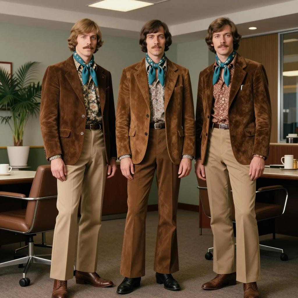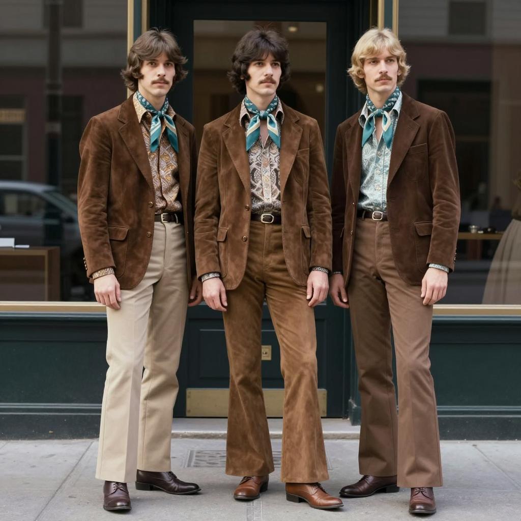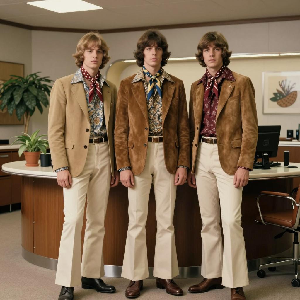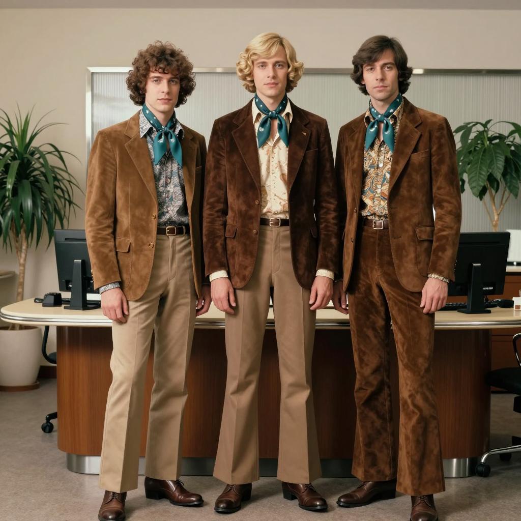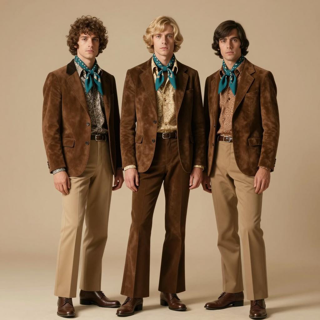 1970s fashion outfits, three men in tailored menswear — suede jackets, patterned shirts, flared trousers and scarves — styled in caramel suede jacket with mustard flares and paisley shirt on mixed group with one curly-haired brunette, one wavy-haired blonde, one straight dark-haired man standing together in retro office lobby with plants and chrome details under cooler neutral light for catalog-style clarity, vintage mens fashion editorial, full body pose, 35mm film look