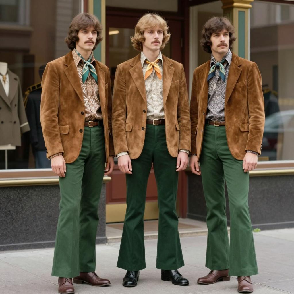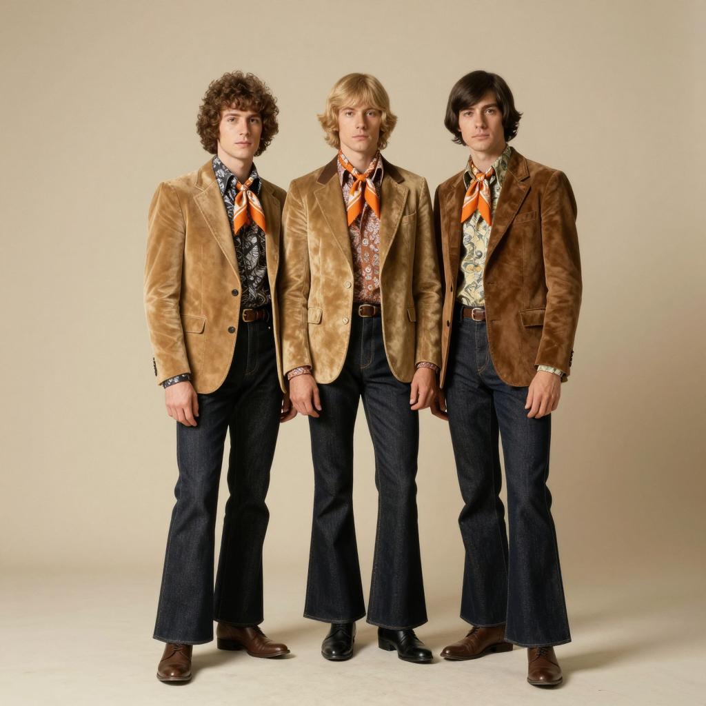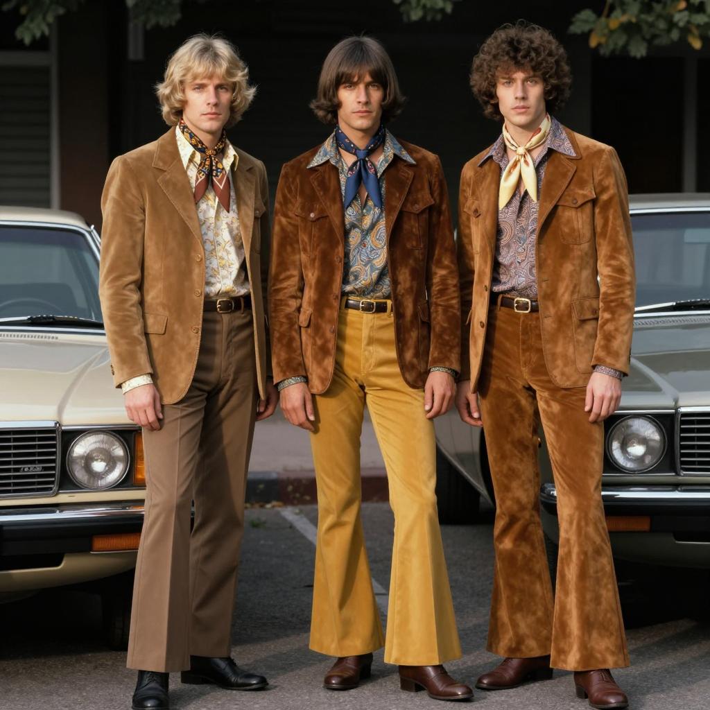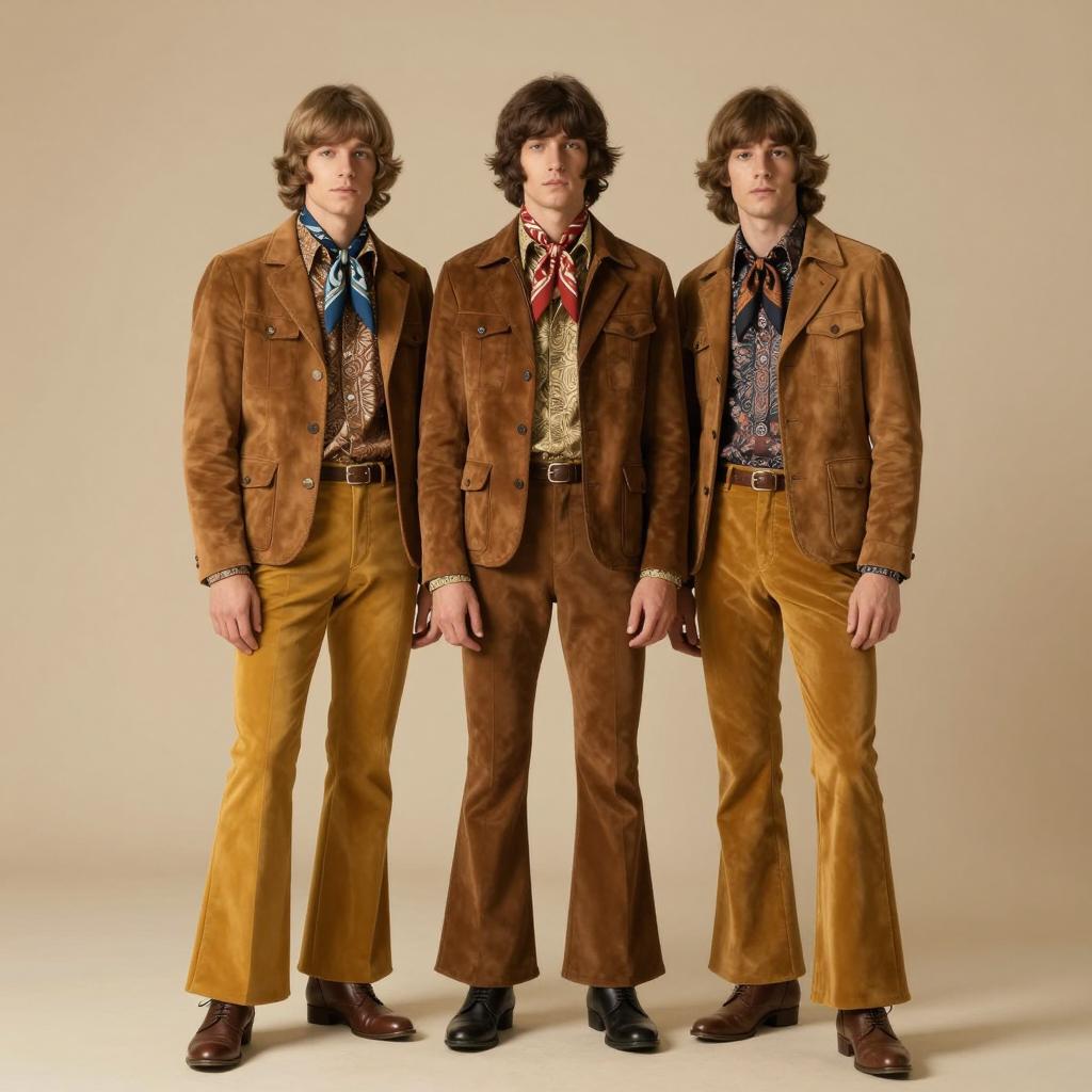 1970s fashion outfits, three men in tailored menswear — suede jackets, patterned shirts, flared trousers and scarves — styled in caramel suede jacket with mustard flares and paisley shirt on mixed group with one curly-haired brunette, one wavy-haired blonde, one straight dark-haired man standing together in retro office lobby with plants and chrome details under cooler neutral light for catalog-style clarity, vintage mens fashion editorial, full body pose, 35mm film look