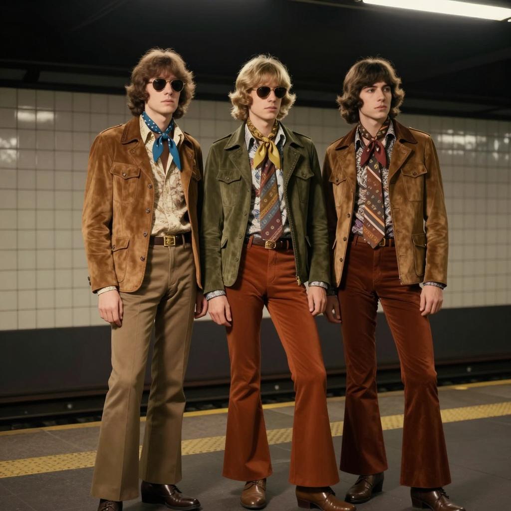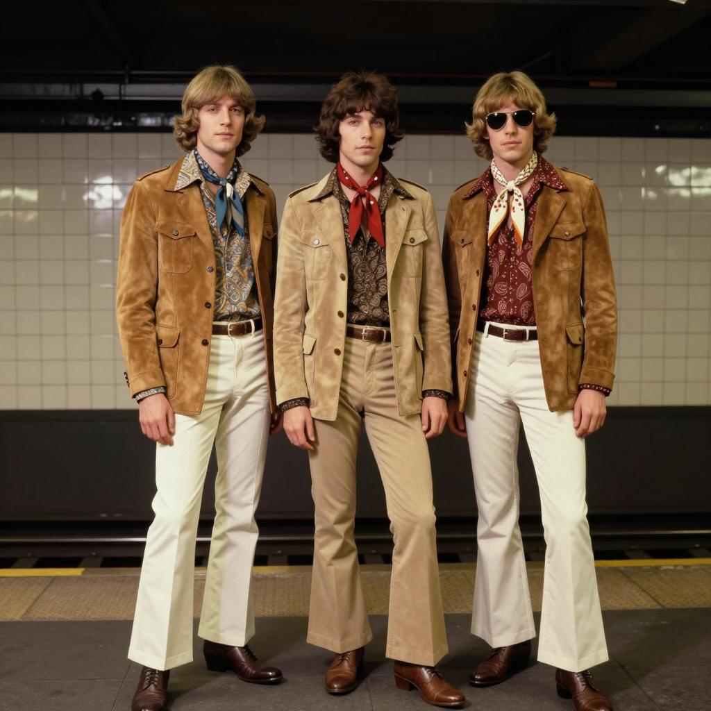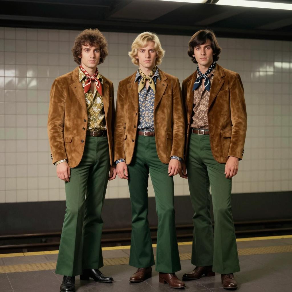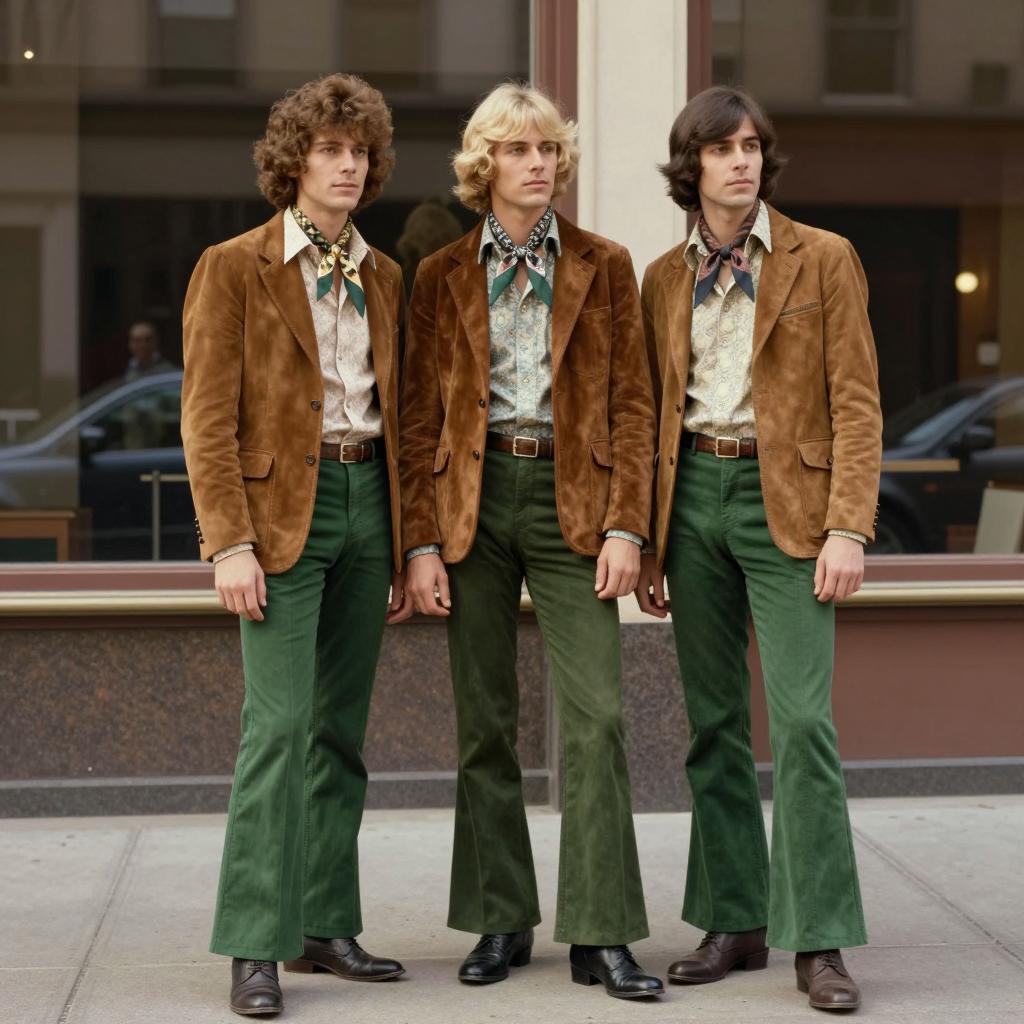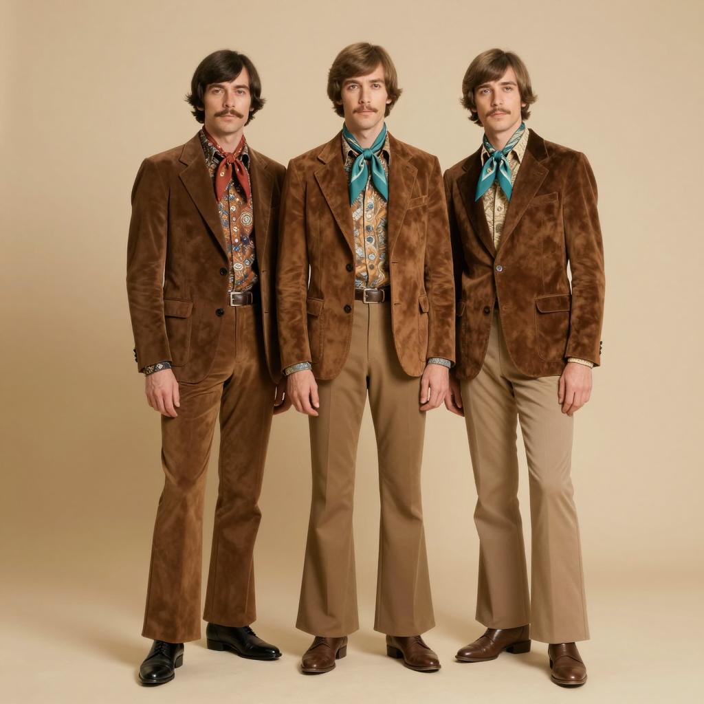 1970s fashion outfits, three men in tailored menswear — suede jackets, patterned shirts, flared trousers and scarves — styled in caramel suede jacket with mustard flares and paisley shirt on mixed group with one curly-haired brunette, one wavy-haired blonde, one straight dark-haired man standing together in retro office lobby with plants and chrome details under cooler neutral light for catalog-style clarity, vintage mens fashion editorial, full body pose, 35mm film look