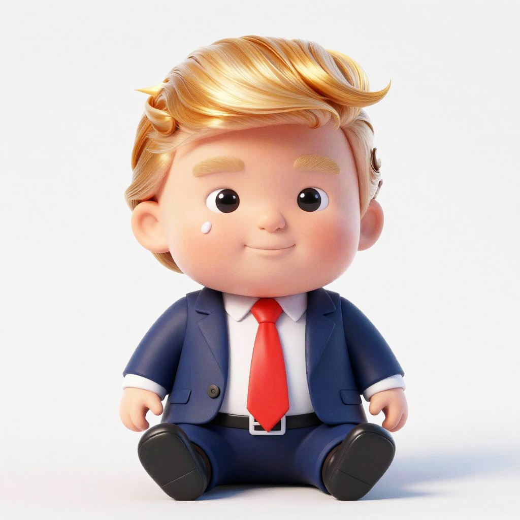 Baby trump costume, chubby baby in a humorous Donald Trump outfit with exaggerated hair and suit, playful cartoon style, vibrant colors, soft lighting, 3D render