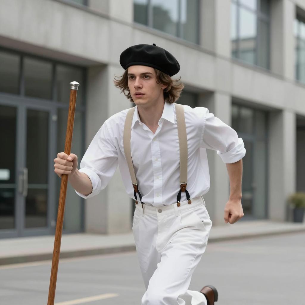Man in white shirt, white pants, beige suspenders, black beret, holding wooden batons in both hands. Standing in front of modern building with large windows and concrete ures. Arms slightly raised. Light brown hair, fair skin. Full body shot.