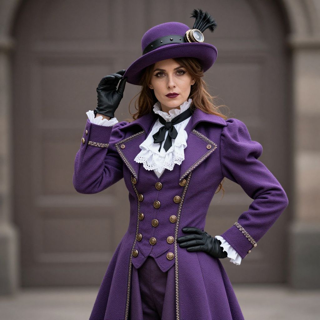 Purple Steampunk Costume, woman in a purple coat and hat posing for a picture