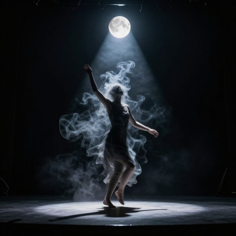 Photograph of a silhouetted dancer with flowing white smoke enveloping her body, standing under a spotlight against a dark background. The dancer, wearing a short dress and ballet flats, raises one arm gracefully. A bright, full moon is illuminated in the upper center, casting a soft glow on the dancer. The stage floor is slightly reflective, highlighting her shadow. The smoke swirls around her, creating a mystical, ethereal effect. The overall mood is magical and dramatic, with strong contrasts between the dark background and the bright spotlight.