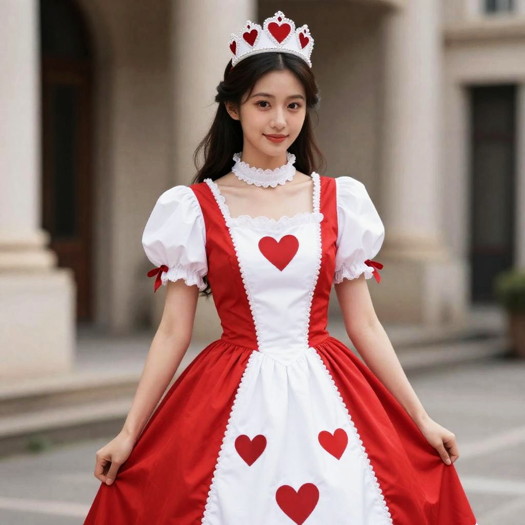 Royal Queen Hearts Woman Costume, woman in red and white dress with crown and red dress