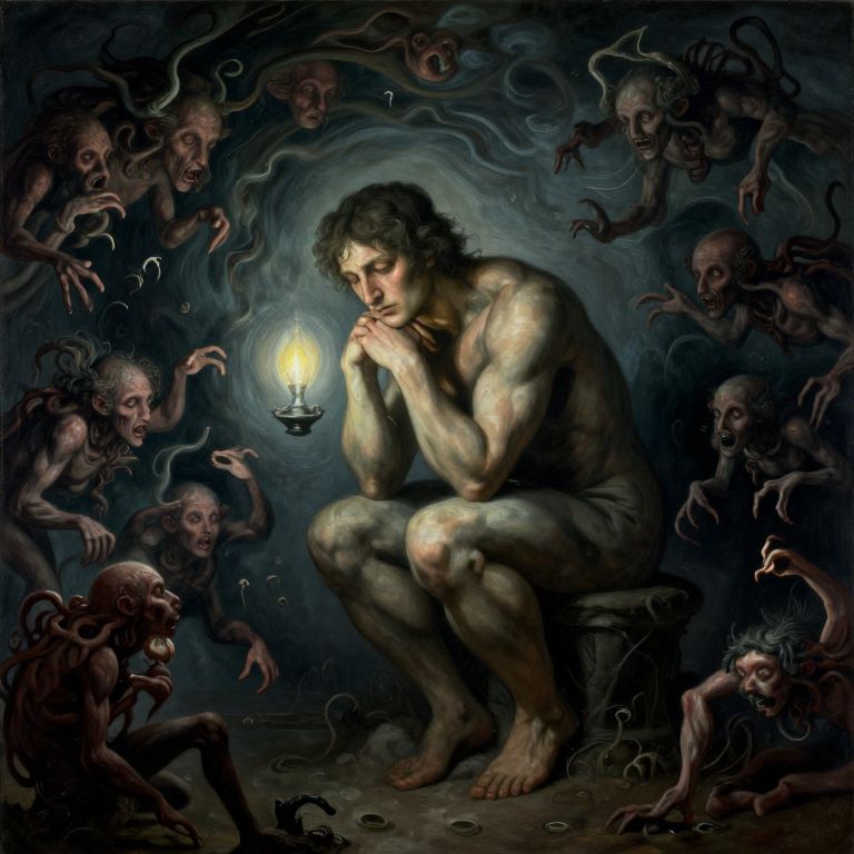 This digital painting depicts a muscular, naked man with curly dark hair, crouching in a dark, eerie cave. He holds a glowing lantern in his right hand, illuminating his face and upper body. Surrounding him are numerous shadowy, grotesque, and twisted humanoid figures with distorted faces and elongated limbs, reaching towards him with menacing expressions. The cave background is dark and misty, with swirling shadows adding to the ominous atmosphere. The man's skin is pale and his expression is one of fear and contemplation. The overall style is reminiscent of dark fantasy art, with a focus on contrast and dramatic lighting.