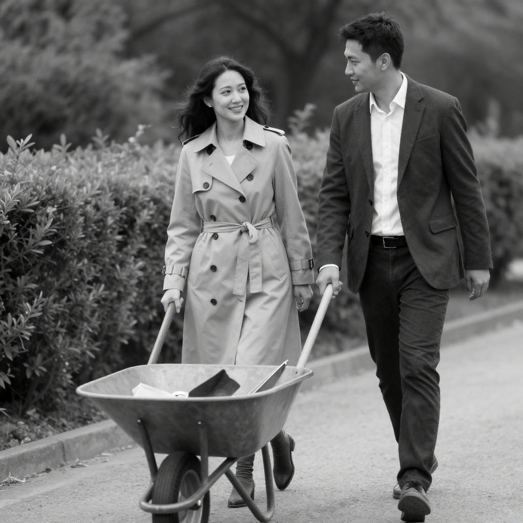 Black-and-white photograph of a couple walking on a path. The woman, with long dark hair, wears a light trench coat and dark pants, smiling. The man, with short dark hair, wears a dark blazer, white shirt, and dark pants, pushing a wheelbarrow with a shovel and some objects. Background includes a hedge and blurred trees.