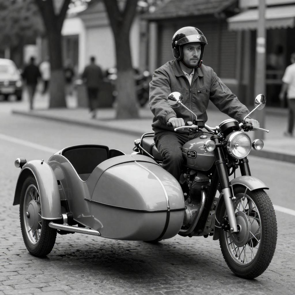 Black-and-white photograph of a man riding a vintage motorcycle with a sidecar, parked on a cobblestone street. The man, wearing a helmet and jacket, sits on the motorcycle, with the sidecar's rear visible. Trees and blurred background elements are behind him. The motorcycle has classic, curved lines and chrome details.