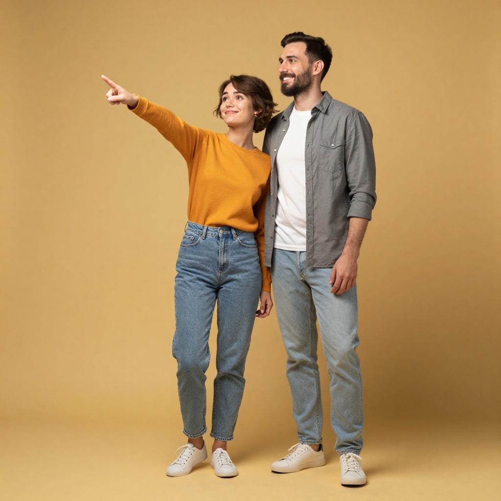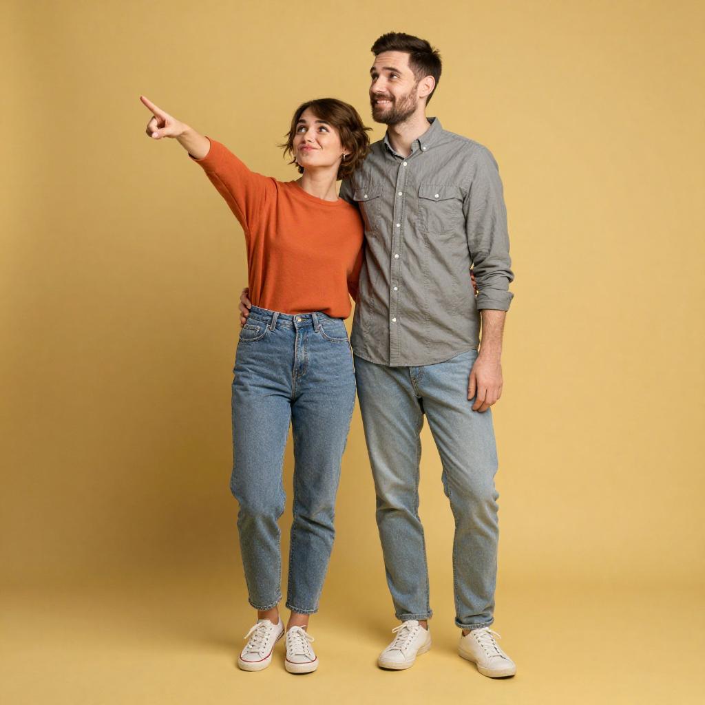 Photograph of a cute couple standing against a solid mustard-yellow background. The woman, with short brown hair, is wearing an orange long-sleeve shirt and light blue jeans, pointing forward with a playful expression. The man, with short dark hair and a beard, is in a gray button-up shirt and light blue jeans, smiling and leaning into her. Both are wearing white sneakers. They're standing close, looking happy and relaxed.