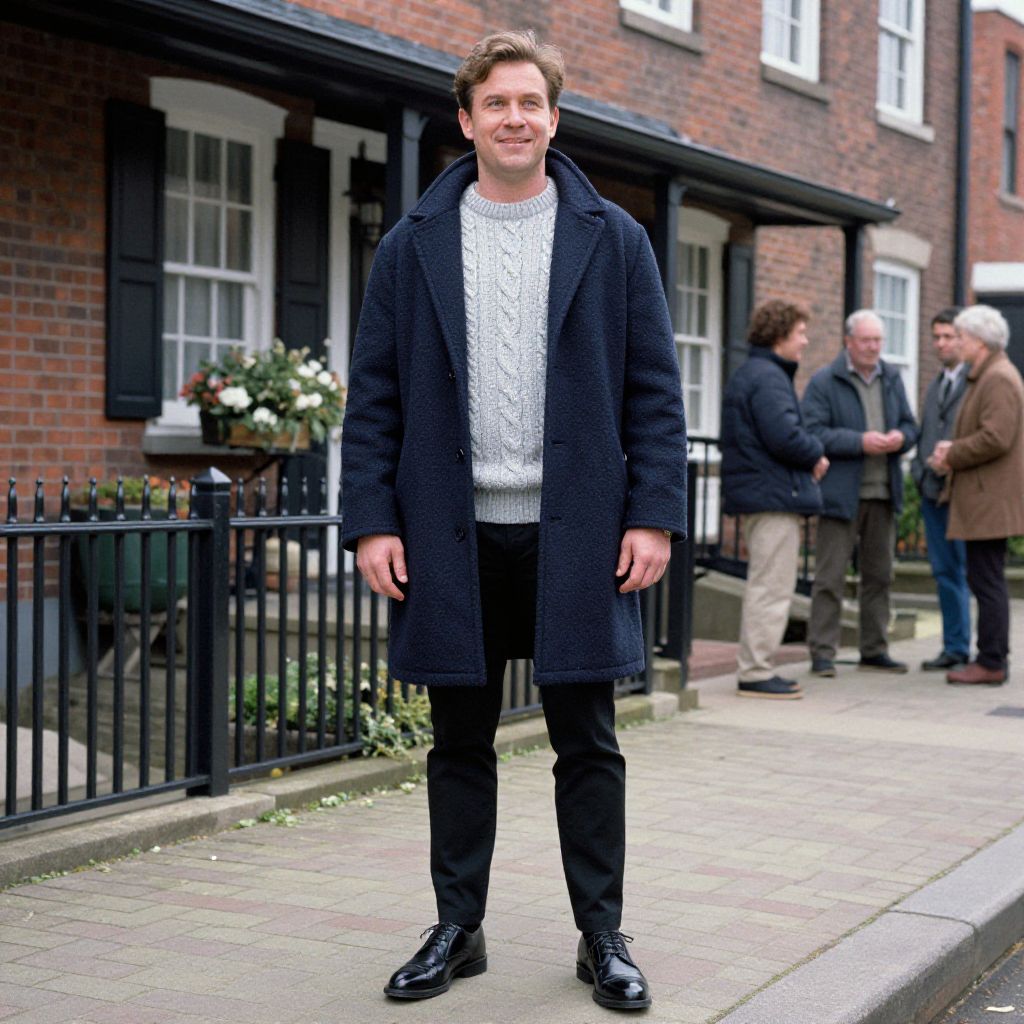 A man, over-sized wool overcoat in navy, chunky cable-knit sweater in light gray, fitted black trousers, polished oxford shoes in black leather, historic brick buildings, welcoming front porches, friendly neighbors chatting, chromogenic film, relaxed smile, warm and inviting atmosphere. Man has masculine face and piercing eyes