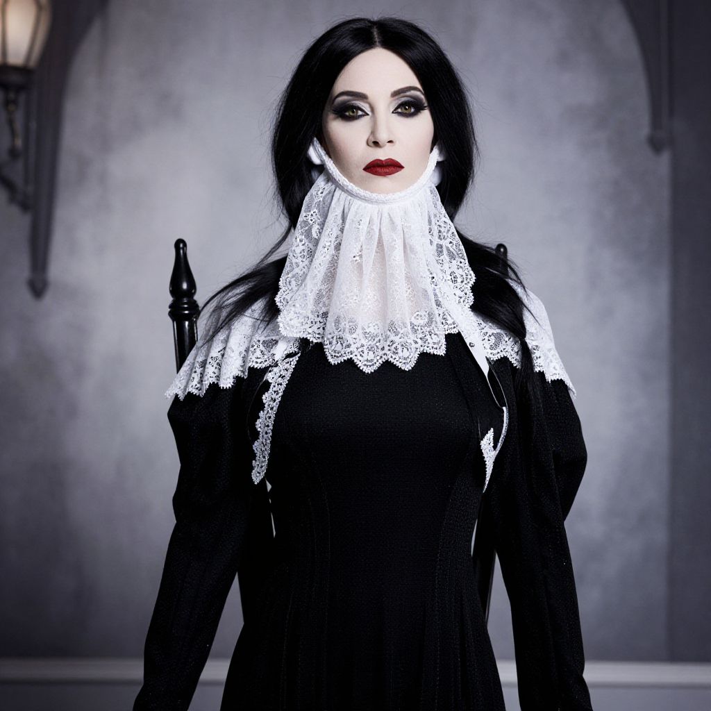 Gothic woman with pale skin, black dress, white lace collar, red lipstick, and dark hair, standing against a dimly lit, gray