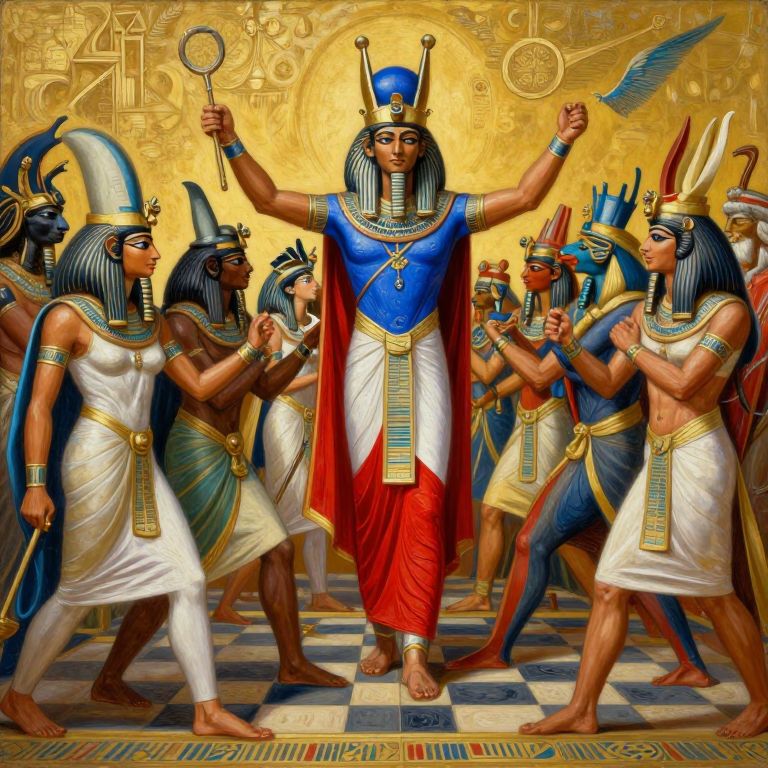 The image depicts a highly detailed and vibrant oil painting featuring a central figure standing on a checkered floor, flanked by Egyptian gods and goddesses engaged in a dynamic battle. The central figure, adorned in blue and red, stands tall and majestic, with outstretched arms and a crown on their head, symbolizing authority and power. Surrounding this figure are various deities, each rendered in intricate detail, with distinct colors and textures that add depth and realism to the scene. Osiris, Isis, and Horus are among the identifiable figures, each depicted in a dramatic pose, suggesting a moment of intense conflict or divine intervention. The background is a rich tapestry of gold and yellow hues, creating a sense of grandeur and otherworldliness. The painting is meticulously crafted, with a high level of detail in the textures of the clothing, the expressions of the figures, and the intricate patterns on the checkered floor. The overall composition is dynamic and balanced, with the central figure serving as the focal point, drawing the viewer's eye through the scene and capturing the essence of ancient Egyptian mythology in a visually striking manner.