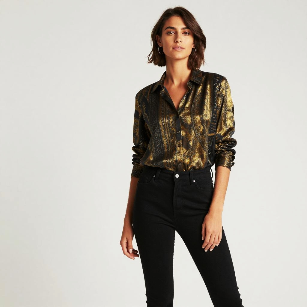 Elegant Woman in Black Satin Shirt