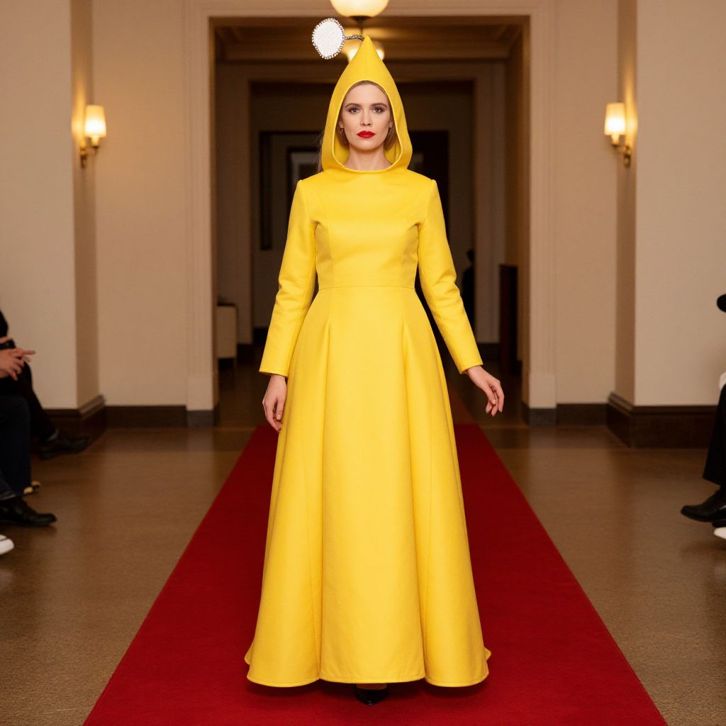 Photograph of a woman in a bright yellow, long-sleeved dress and matching hood with bunny ears, walking down a red carpeted hallway with