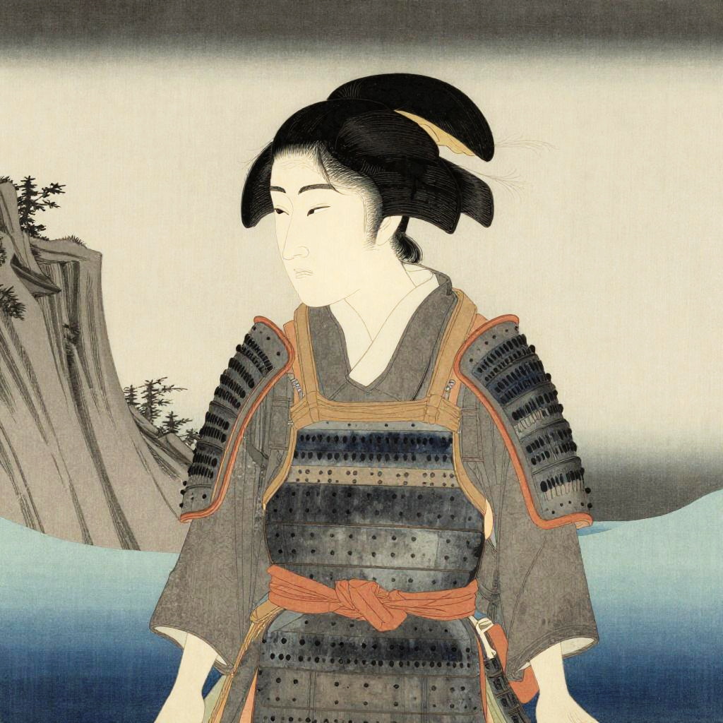 Portrait of a young elegant woman with blonde hair styled in an updo, wearing a vintage-inspired blue gown embroidered with floral patterns. She sits in a classical ornate setting with warm lighting, surrounded by antique decor, including golden framed paintings and flower arrangements. The atmosphere evokes a historical or royal ambiance.