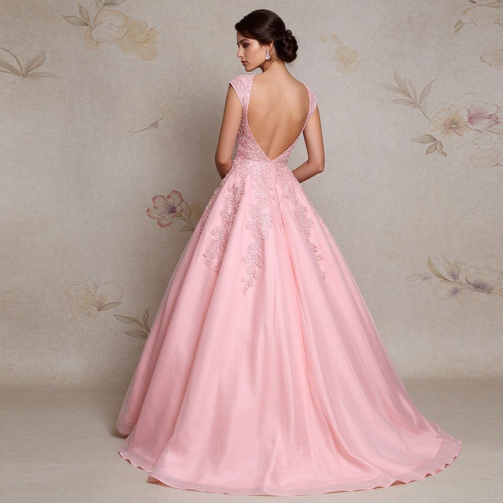 Elegant woman showcasing a stunning backless pink formal ball gown adorned with intricate embellishments, gracefully draped against a floral-patterned backdrop.