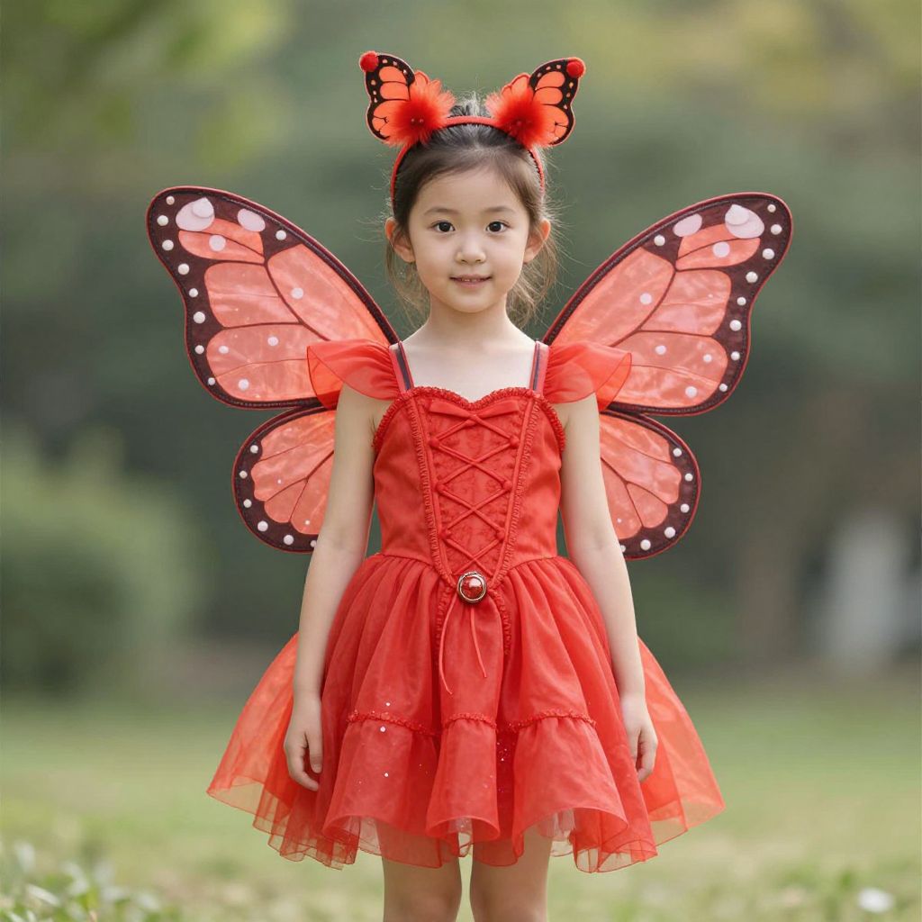Photograph of an Asian girl wearing a red butterfly costume with red wings, red dress, and butterfly headband, standing in a green, blurred outdoor