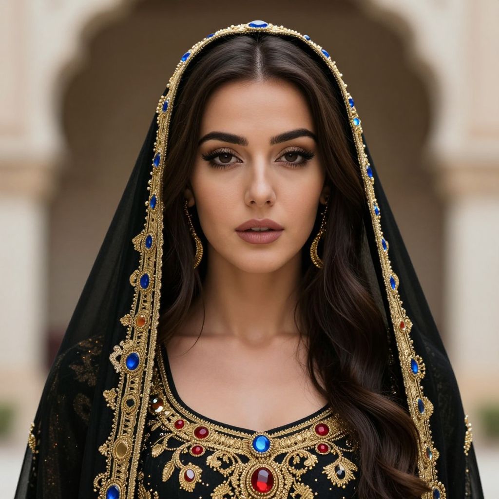 Photograph of a beautiful woman with long, dark brown hair, wearing a black veil adorned with gold embroidery and blue gemstones. She has dark, arched eyebrows, full lips, and a serious expression. Her outfit features intricate gold designs with red and blue gemstones, and she's wearing matching gold earrings. The background is blurred, featuring archways, suggesting an elegant, historic setting.
