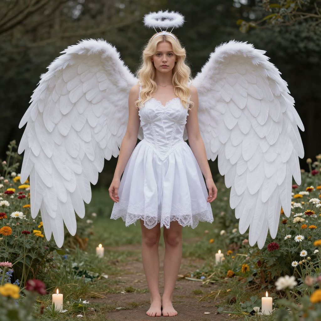 Photograph of a blonde woman with fair skin standing in a garden path. She wears a white, sleeveless, lace-trimmed dress and has large, white, feathered angel wings and a glowing halo above her head. The path is lined with candles and colorful flowers. Her expression is neutral, and she stands barefoot. The background is a dark, dense forest, contrasting with the bright, illuminated garden. The overall style combines realistic and fantasy elements, emphasizing her angelic appearance.