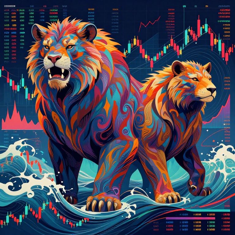 TradingBeasts cryptocurrency trading scene with a powerful mechanical beast, half-lion half-bull, guarding glowing crypto coins, surrounded by dynamic financial graphs and digital code streams in a sci-fi setting with neon accents.