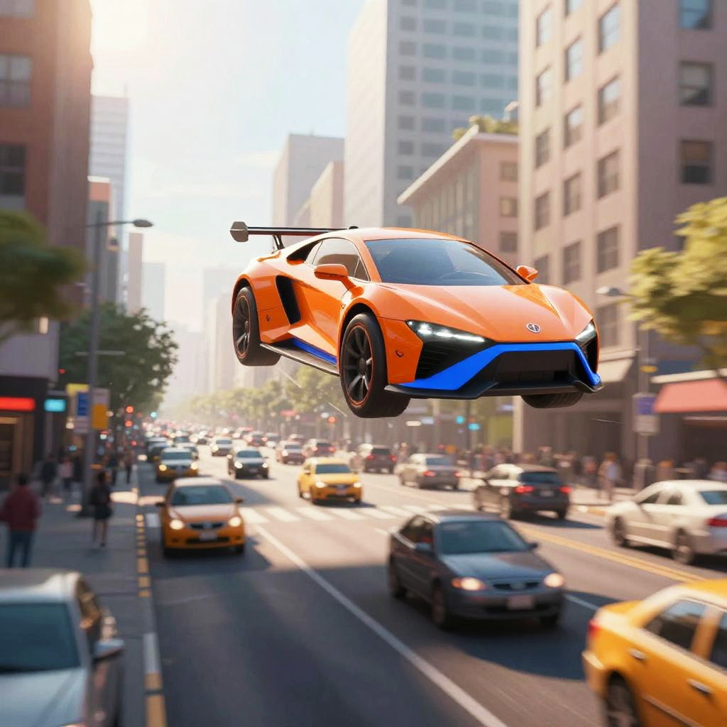 A dynamic digital illustration of a futuristic, flying car with orange and blue accents, hovering above a busy city street. The street is filled with motion-blurred cars, creating a sense of speed and chaos. Tall, sunlit buildings line both sides of the street, with bright sunlight streaming through. The image has a vibrant, energetic feel, with exaggerated colors and a sense of action.