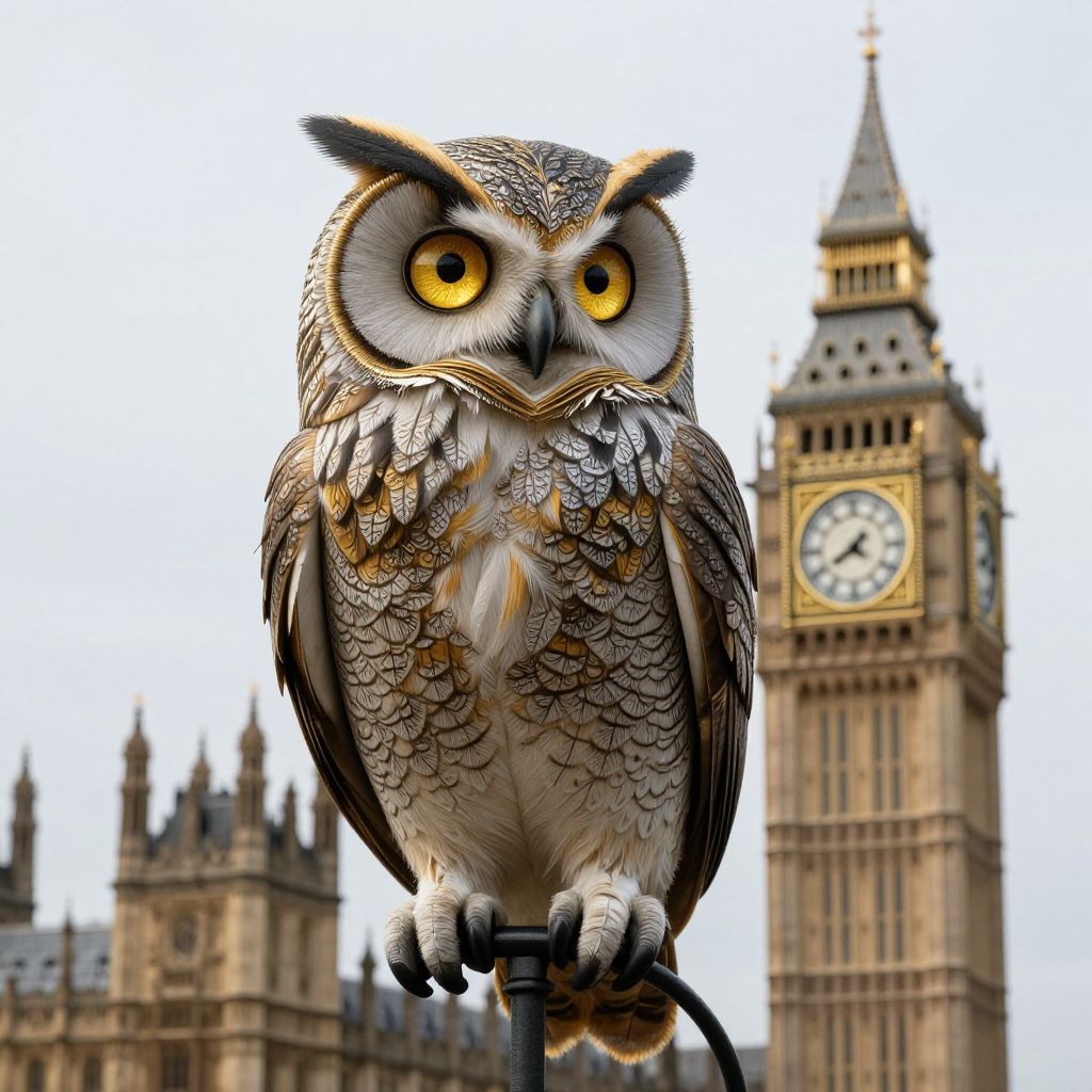 A fantastical 3D-rendered owl, adorned with intricate feathers and piercing golden eyes, perches majestically against the backdrop of Big Ben, blending surreal digital artistry with the timeless elegance of London's iconic clock tower.
