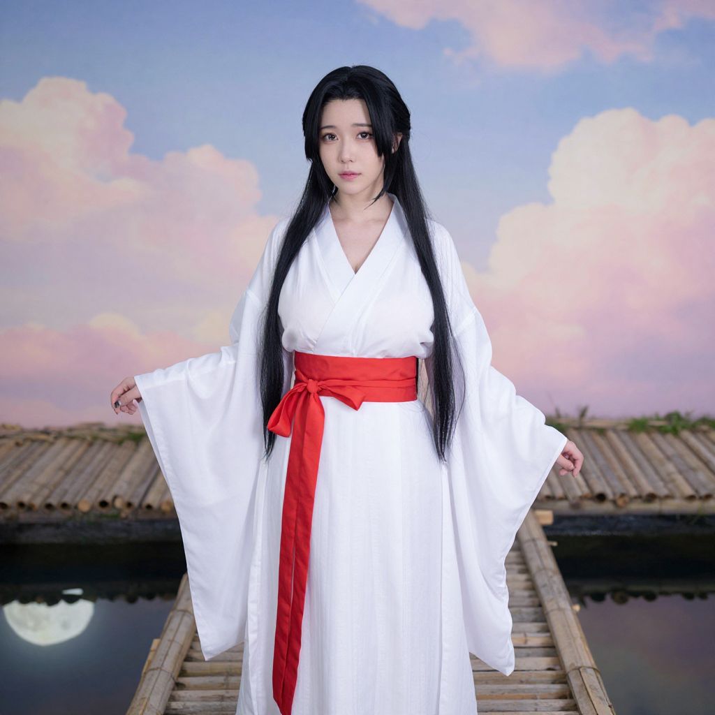 Photograph of an East Asian woman with long black hair standing on a bamboo bridge over a calm waterway. She wears a white traditional kimono with wide sleeves and a bright red obi belt. The background features a pastel-colored sky with pink and blue clouds. The wooden bridge has a rustic texture, with water reflecting the sky. The woman's expression is neutral, and she stands centered, facing the camera. The overall scene is serene and traditional.