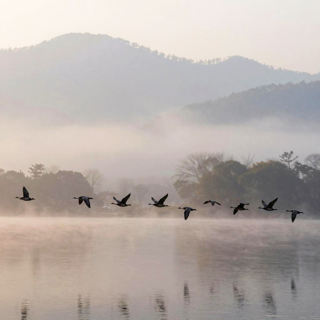 Cohesion represented as a flock of birds flying in perfect harmony over a serene mountain lake, early morning mist, soft pastel colors, impressionistic style capturing the fluid motion and connection between the birds, peaceful and uplifting atmosphere.