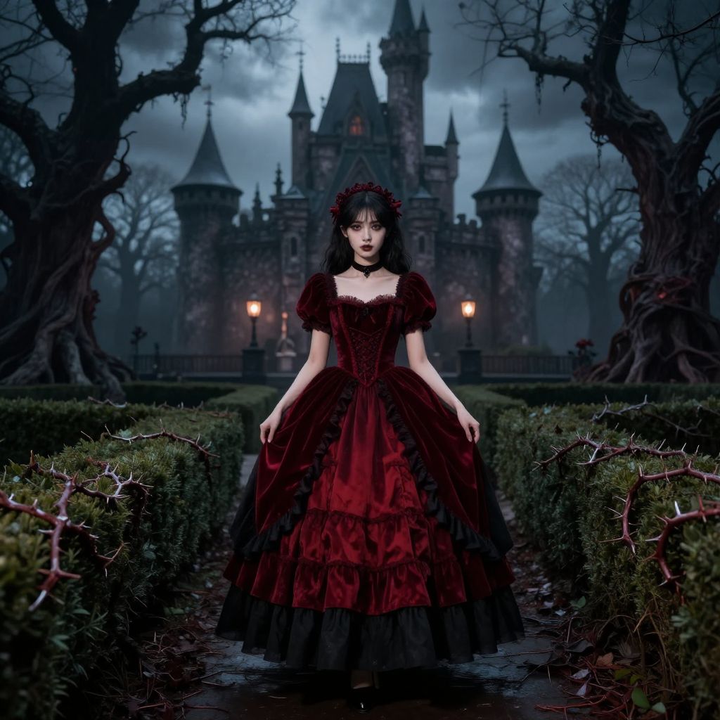 Alice in Wonderland goth reimagined, deep crimson and black layered dress with velvet choker, standing before a gothic castle surrounded by spooky thorn-covered hedges and looming twisted trees, surreal and moody fantasy atmosphere with glowing lanterns