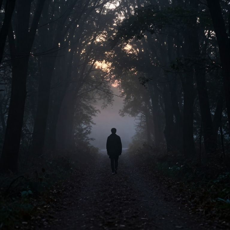 In the hushed embrace of twilight, a solitary figure walks down a mist-laden path, their silhouette swallowed by the ancient forest's whispers, where shadows dance like restless souls, weaving tales of solitude and the eternal search for light.