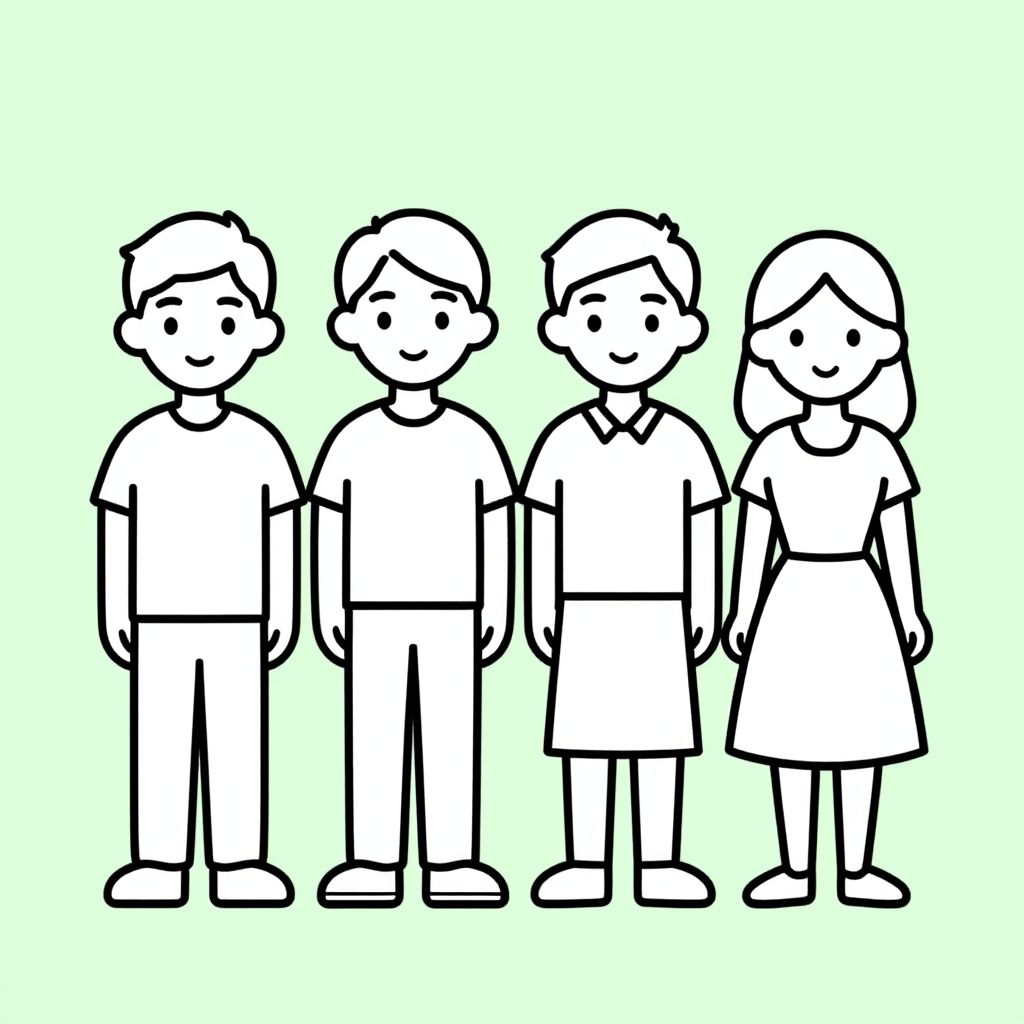 This is a black and white digital line drawing depicting four simple, cartoon-style human figures standing in a line. The figures have round heads, small black circular eyes, and simple smiling faces. From left to right, the first figure is a boy wearing a short-sleeve shirt and pants, the second is a slightly taller boy in a t-shirt and pants, the third is a boy in a t-shirt and shorts, and the fourth is a girl in a short-sleeve dress. All figures have solid black outlines with no additional details or textures. The background is a solid light green color.