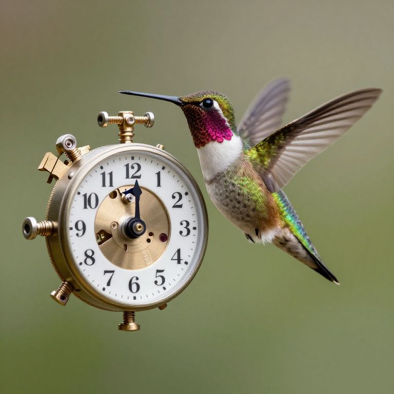 A hummingbird with a clockwork heart flits between time zones, resetting them wherever it lands.