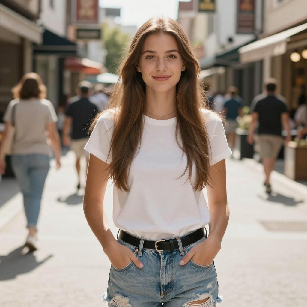 Young confident woman in a casual light blue sundress shopping in a brightly lit grocery store aisle. She has long brown hair and is smiling warmly while making eye contact. The store shelves are stocked with fresh produce and grocery items.