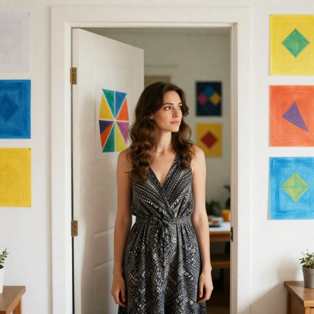Woman with light skin, brown wavy hair, wearing black and white patterned dress, standing in doorway. Walls covered in colorful geometric drawings. Open door behind her, various colored papers and drawings on walls to the left and right. She looks to the right with a neutral expression. Casual indoor setting.