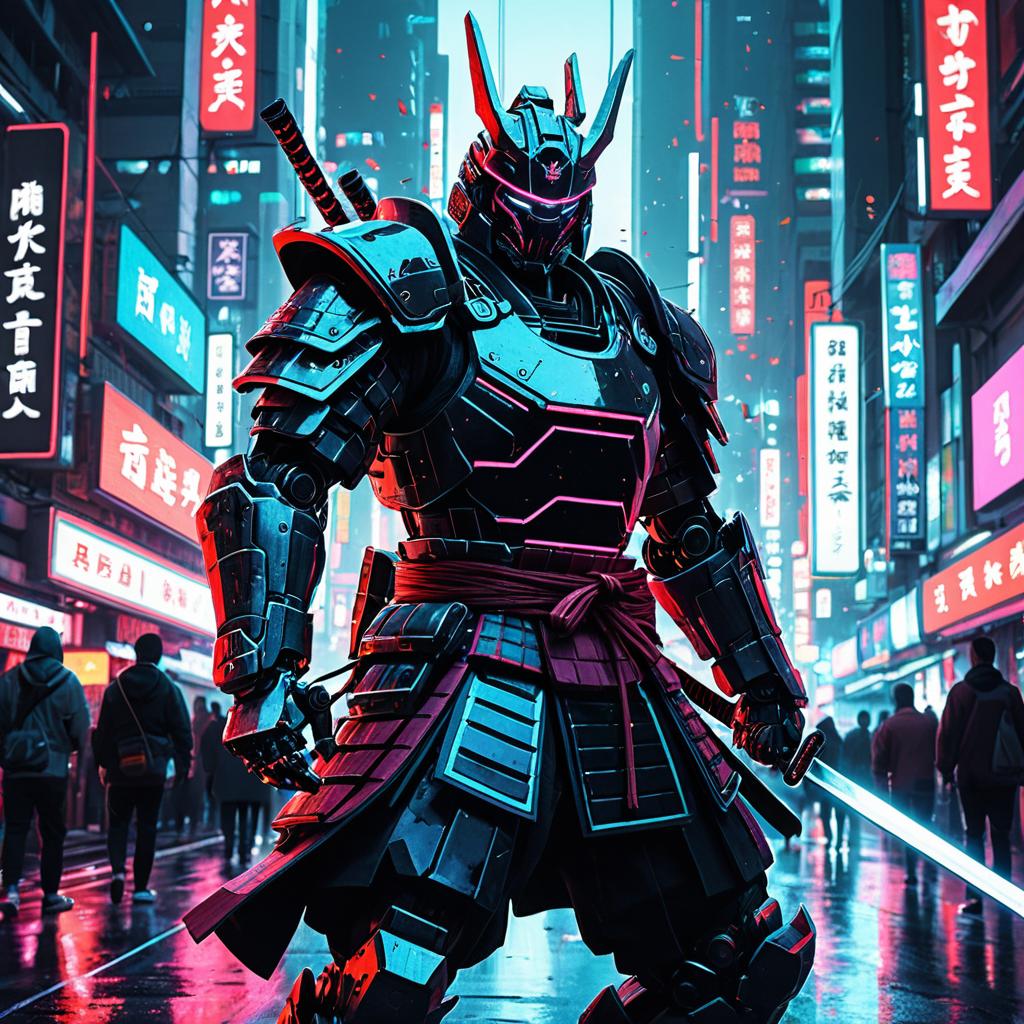 Amazing neon samurai woman, in crimson running on empty street at night, glowing, cyberpunk, with intricate tattoos, luminous armor, rainy futuristic alley with neon signs, over-the-shoulder perspective