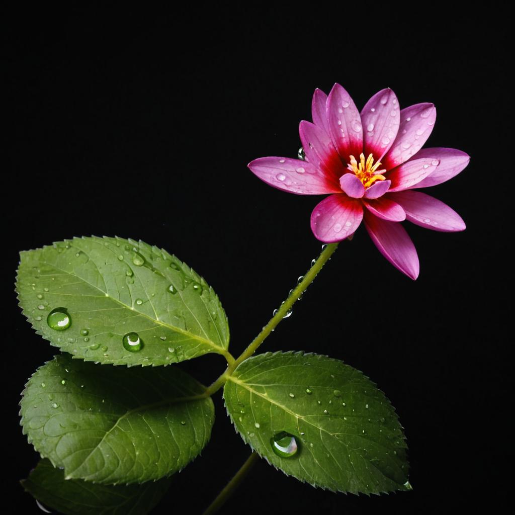 No humans, flower, water drop, realistic, still life, simple background, leaf, pink flower, bud, black background, plant, purple flower, traditional media, red flower, signature