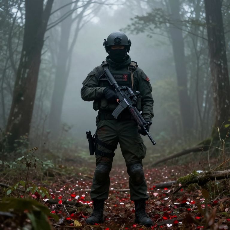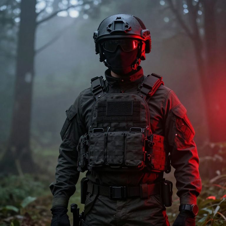 Photograph of a heavily armored soldier in dark forest, wearing helmet with visor, tactical vest, and gloves, illuminated by red light.