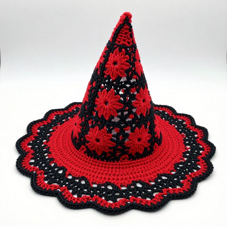 Crocheted red and black lace Halloween witch hat featuring a pointed brim and scalloped edge, showcasing intricate patterns and vibrant colors against a plain background.