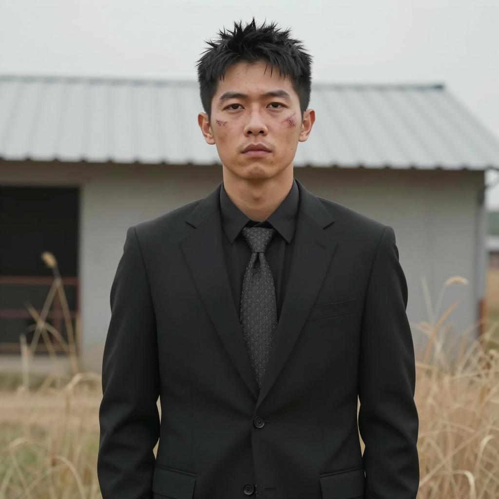 A man in a black cowboy hat, brown jacket, and maroon scarf, with a visible bruise on his left cheek. He looks to the right. Background includes another man in an orange shirt, blurred, and hanging meat.