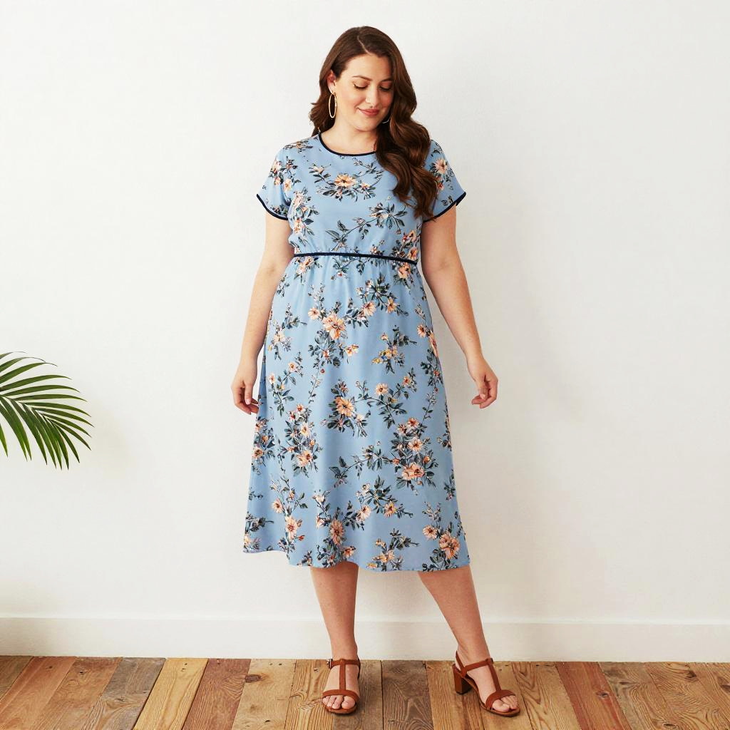 Photograph of a plus-size woman with fair skin and long, wavy brown hair, standing against a white wall. She wears a light blue, knee-length, floral dress with short sleeves and a black waistband, paired with brown, open-toe, sandal heels. She has a gentle smile and relaxed posture, with her right arm slightly bent and left arm hanging by her side. A green potted plant with long leaves is partially visible in the bottom left corner. The wooden floor has a warm, natural tone. The overall style is casual and elegant.