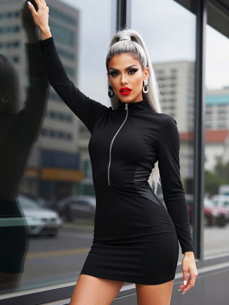 Transgender model, bold street-style fashion portrait, trans woman with high platinum ponytail and strong red lips posing confidently with one arm raised, wearing a bodycon mini-dress in classic black with metallic zipper with contrasting side panels, statement earrings, bright lipstick, polished makeup, blurred modern cityscape reflected in large windows behind, overcast daylight, contemporary urban fashion photography