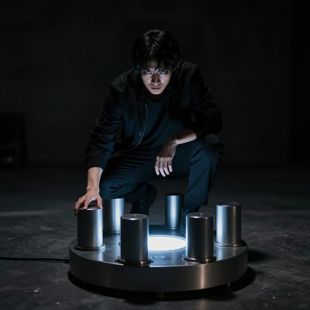 Darkly lit scene, crouching figure in black clothing, intense gaze, atop circular metallic platform with six silver cylinders, blue light from below, shadowy background, high-contrast lighting, person in center, minimal detail on face.