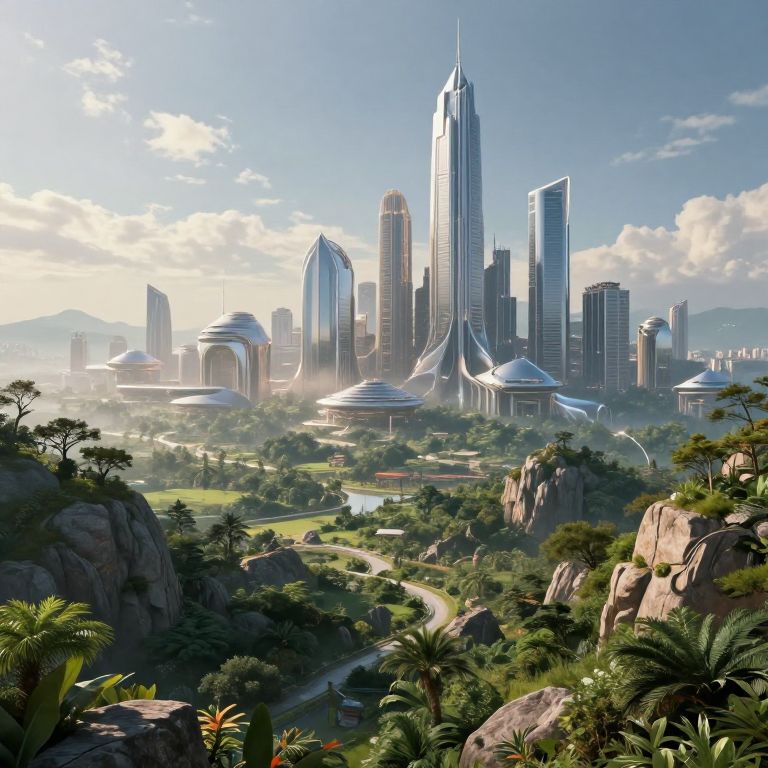 Futuristic City Merging with Lush Landscape