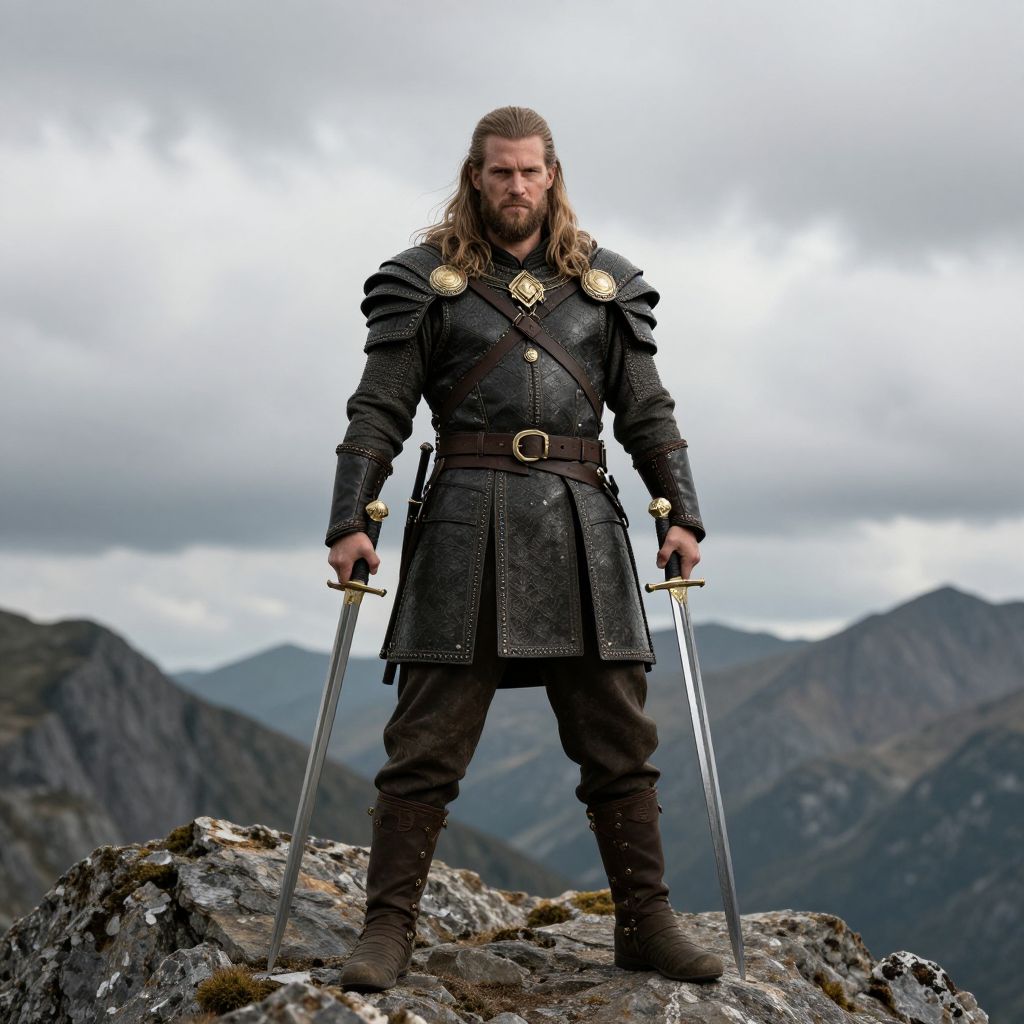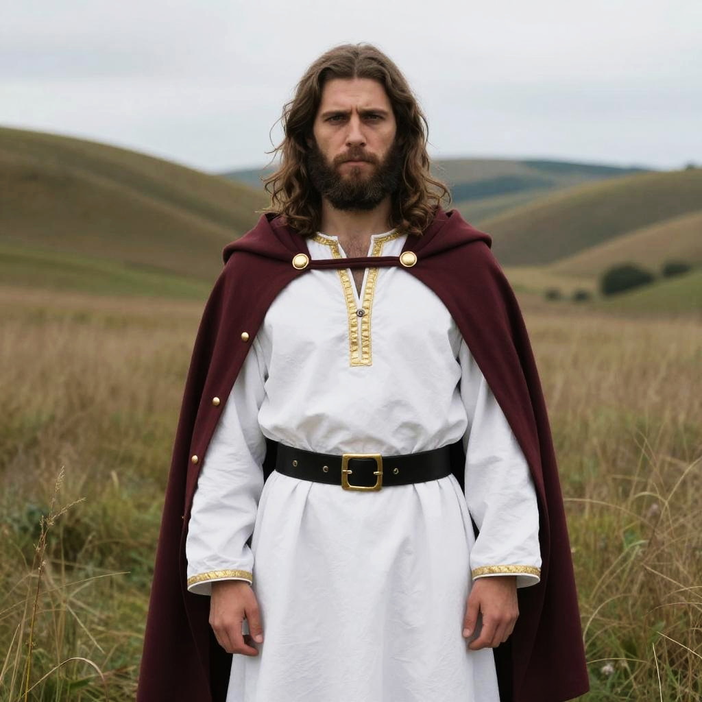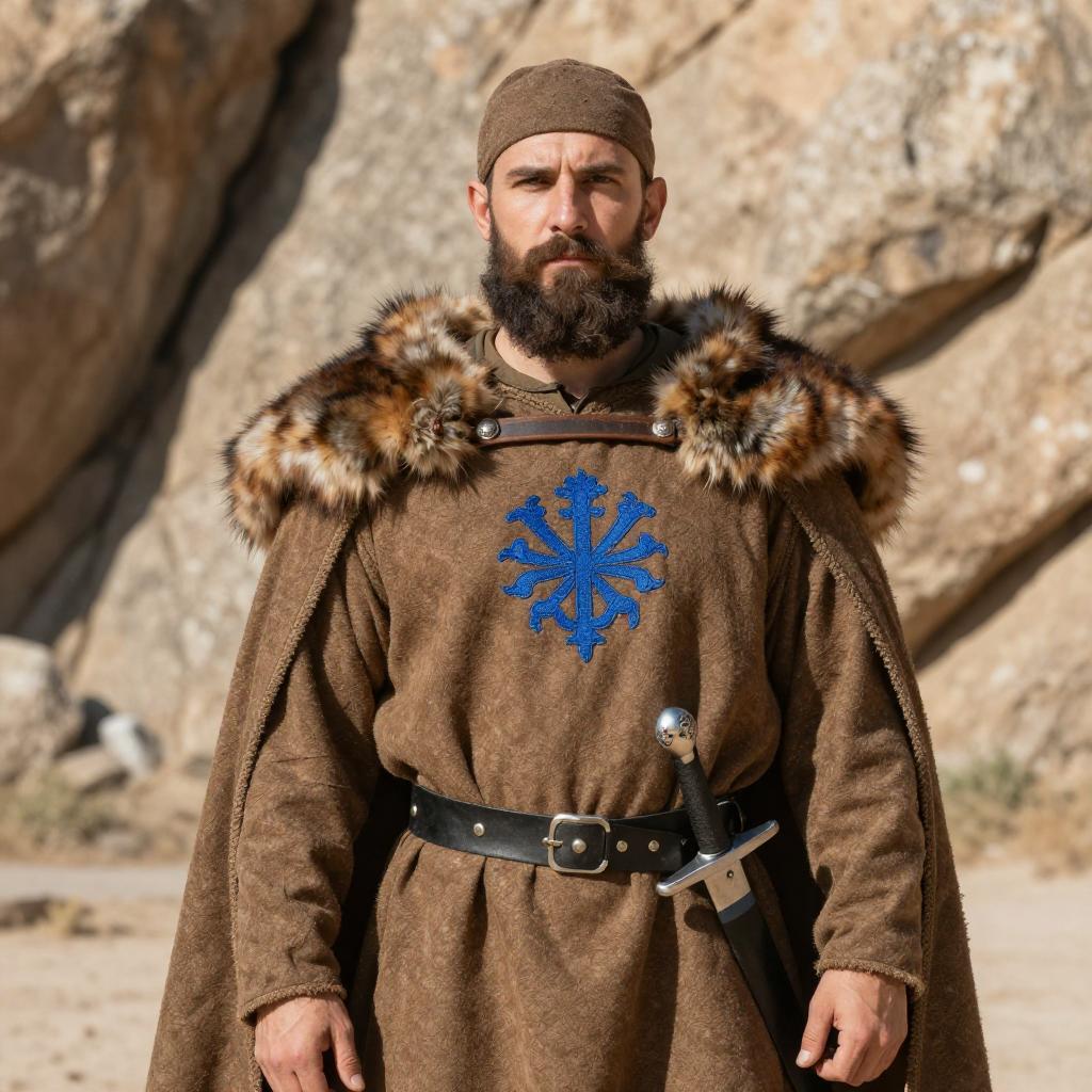 Medieval traveling clothes featuring a cloaked pilgrim walking along a mountain trail, heavy woolen fabrics, simple sandals, overcast skies with dramatic clouds, detailed textures