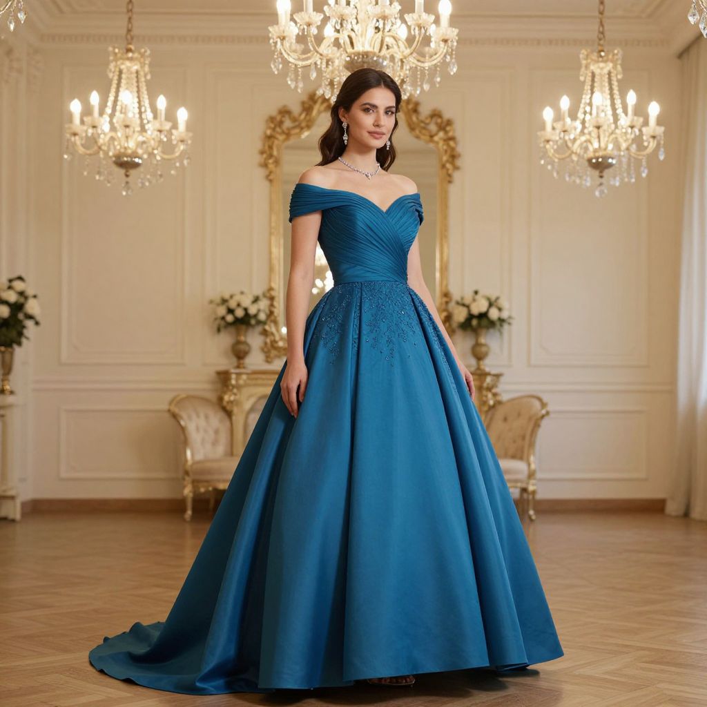 Photograph of a brunette woman in an off-shoulder, vibrant blue ball gown, standing in an elegant, chandelier-lit room.