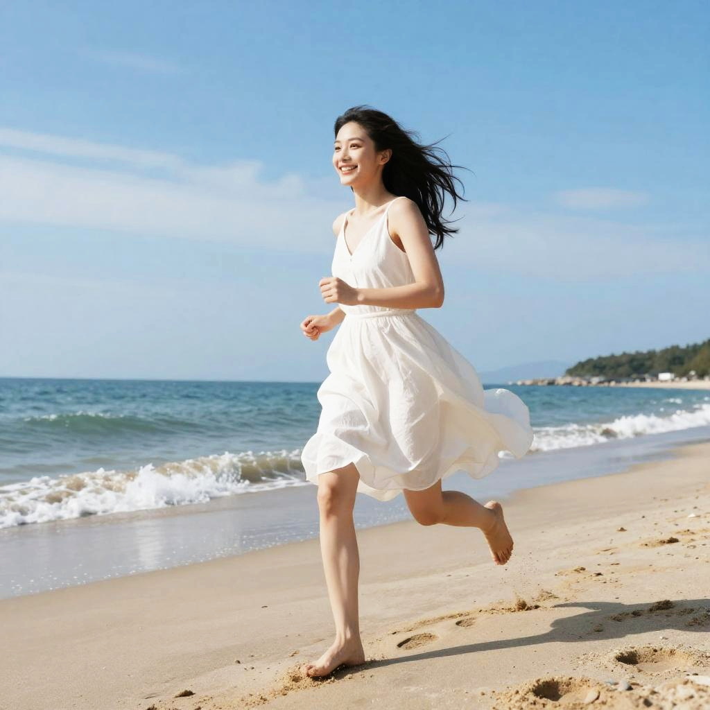 Attractive woman beach, running along the shore with a flowing white dress, footprints in wet sand, playful smile, bright blue sky with wispy clouds, lively and dynamic scene