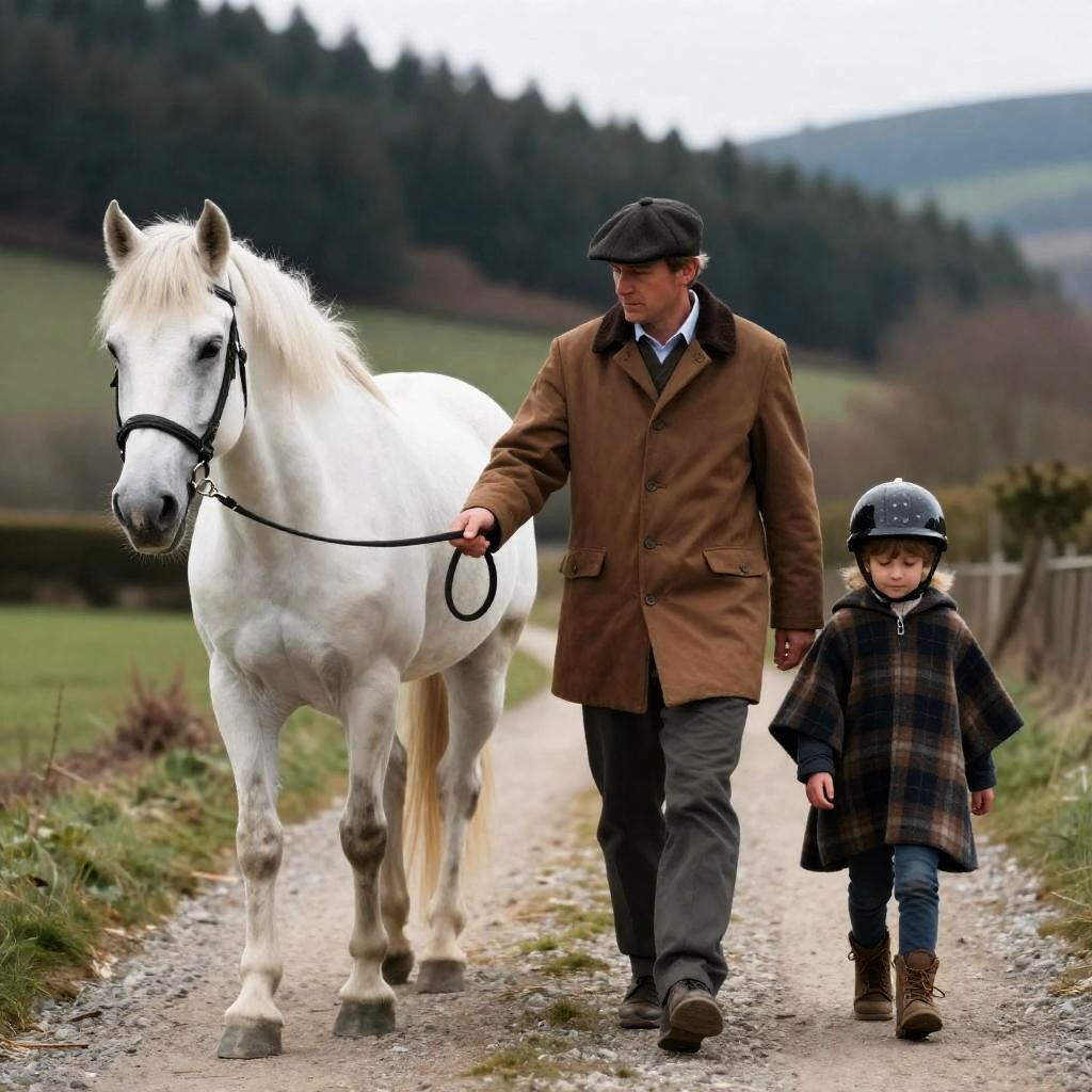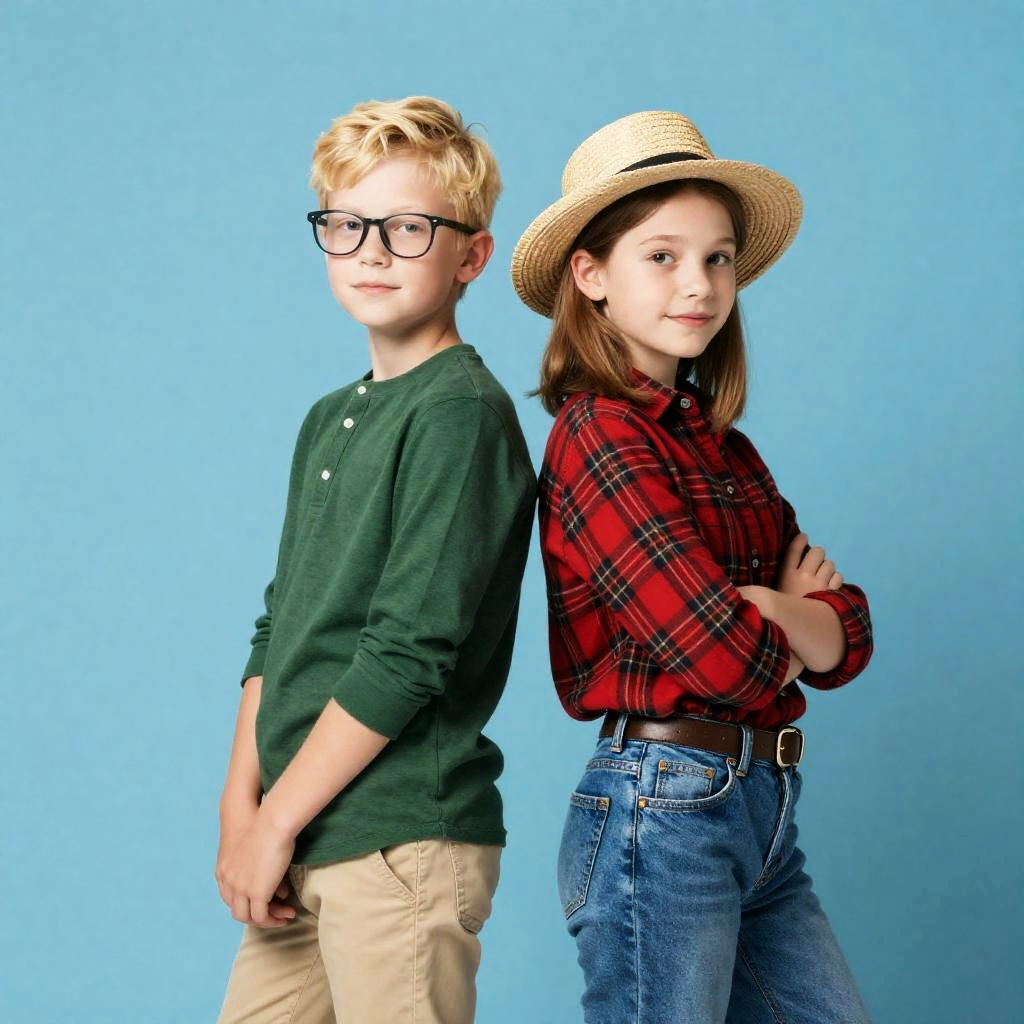 Photograph of two young boys riding a white horse. The boy on the left has curly brown hair, wears a red shirt, and grips the horse's reins. The boy on the right has black hair, wears a blue jacket, and raises a black hat. Bright yellow and purple sunburst background. Horse is rearing up, mid-gallop. Both boys have intense expressions.